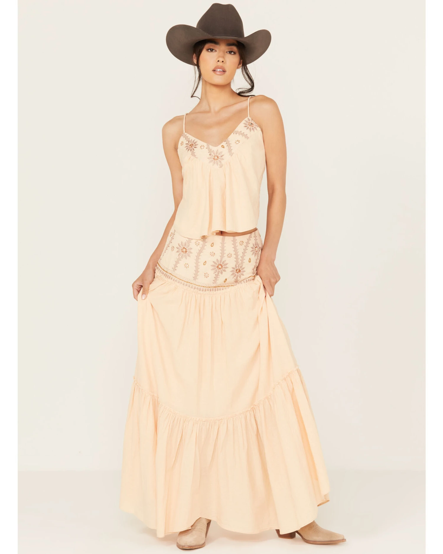 - Solid cream design with floral embroidered waistline