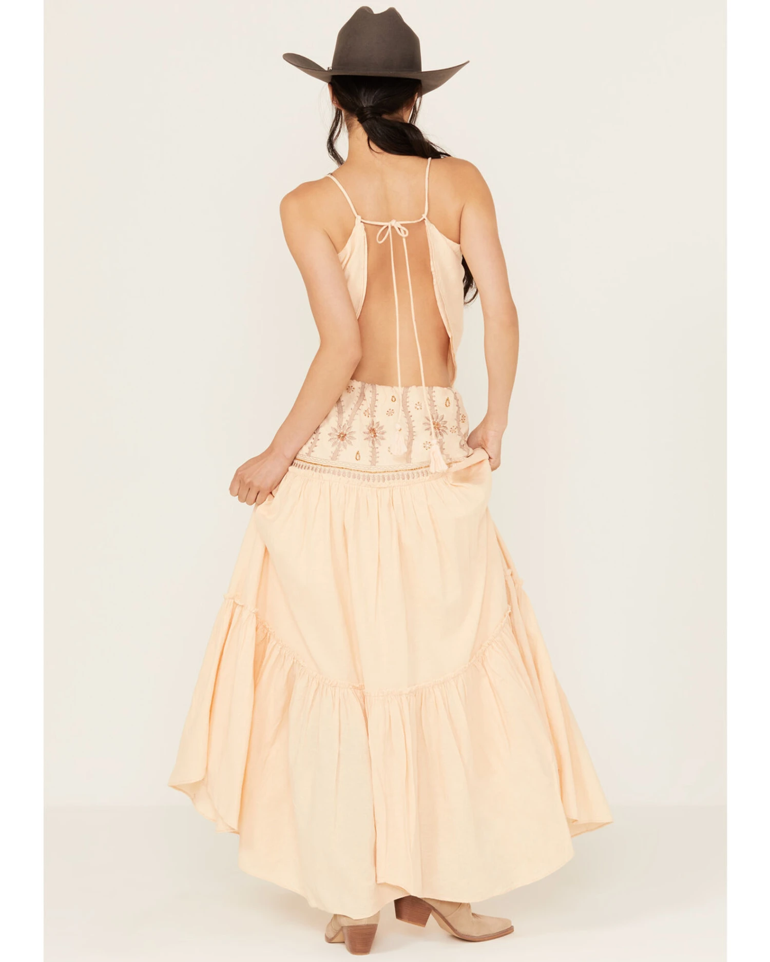- Spaghetti straps with self tie and open back design