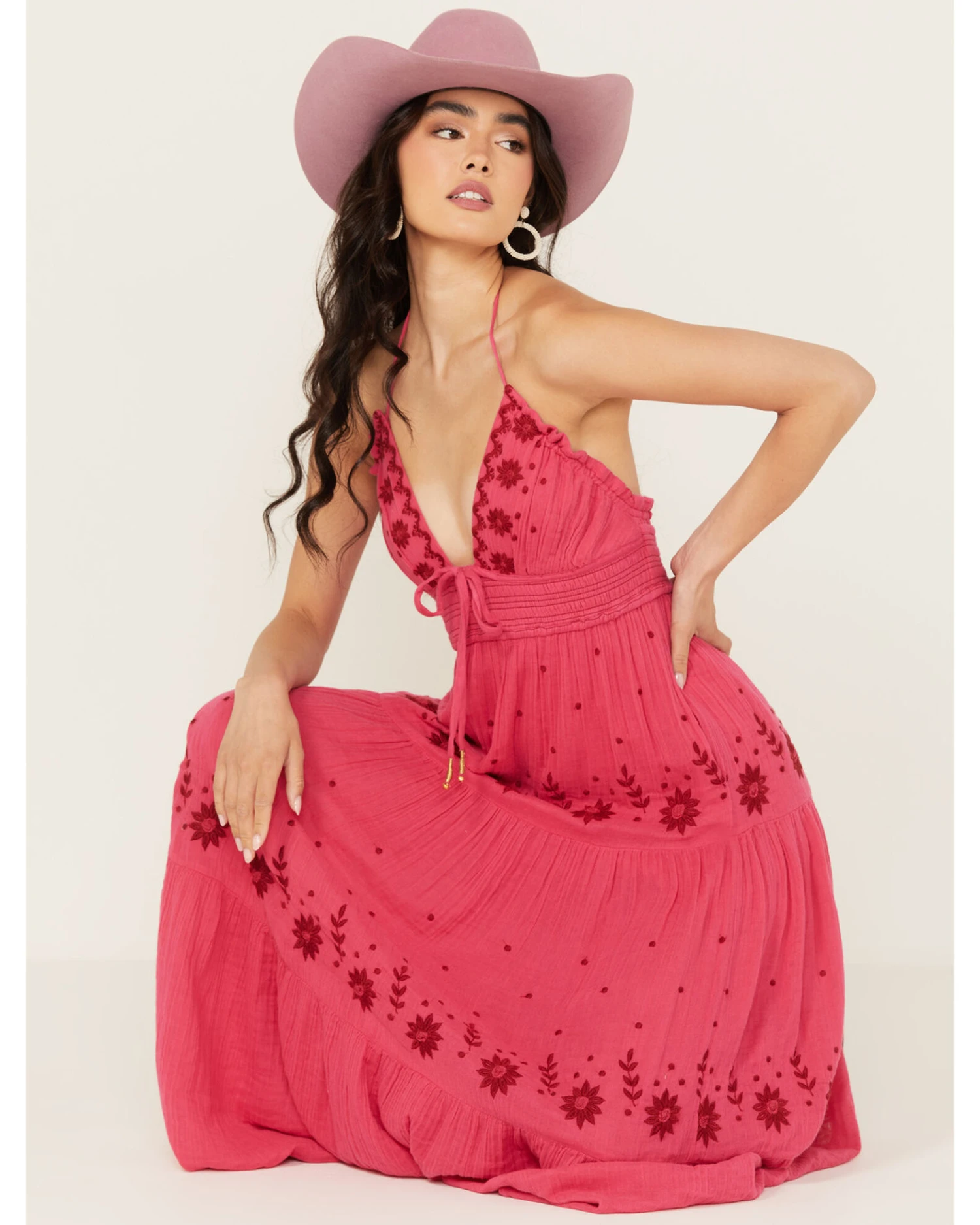 - Hot pink with embroidered floral designs throughout