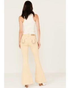 - Five-pocket design with back faux button flap and Southwestern rhinestone embroidery
